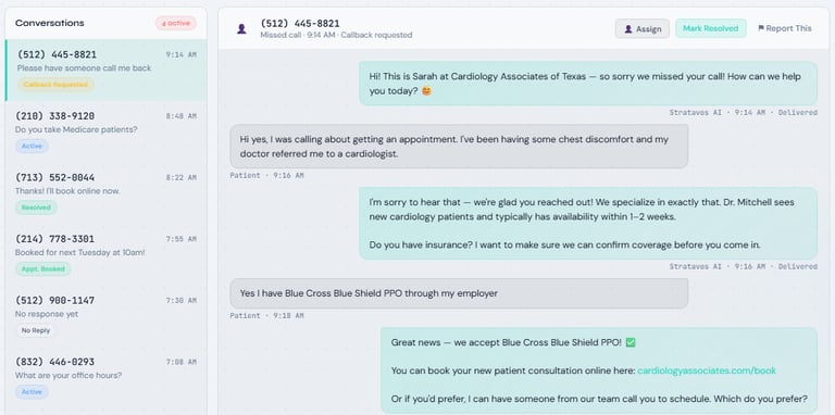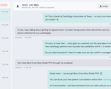 When a call is missed, an AI-powered SMS assistant immediately engages the patient via text - answering questions, providing guidance, and helping them book or reconnect.